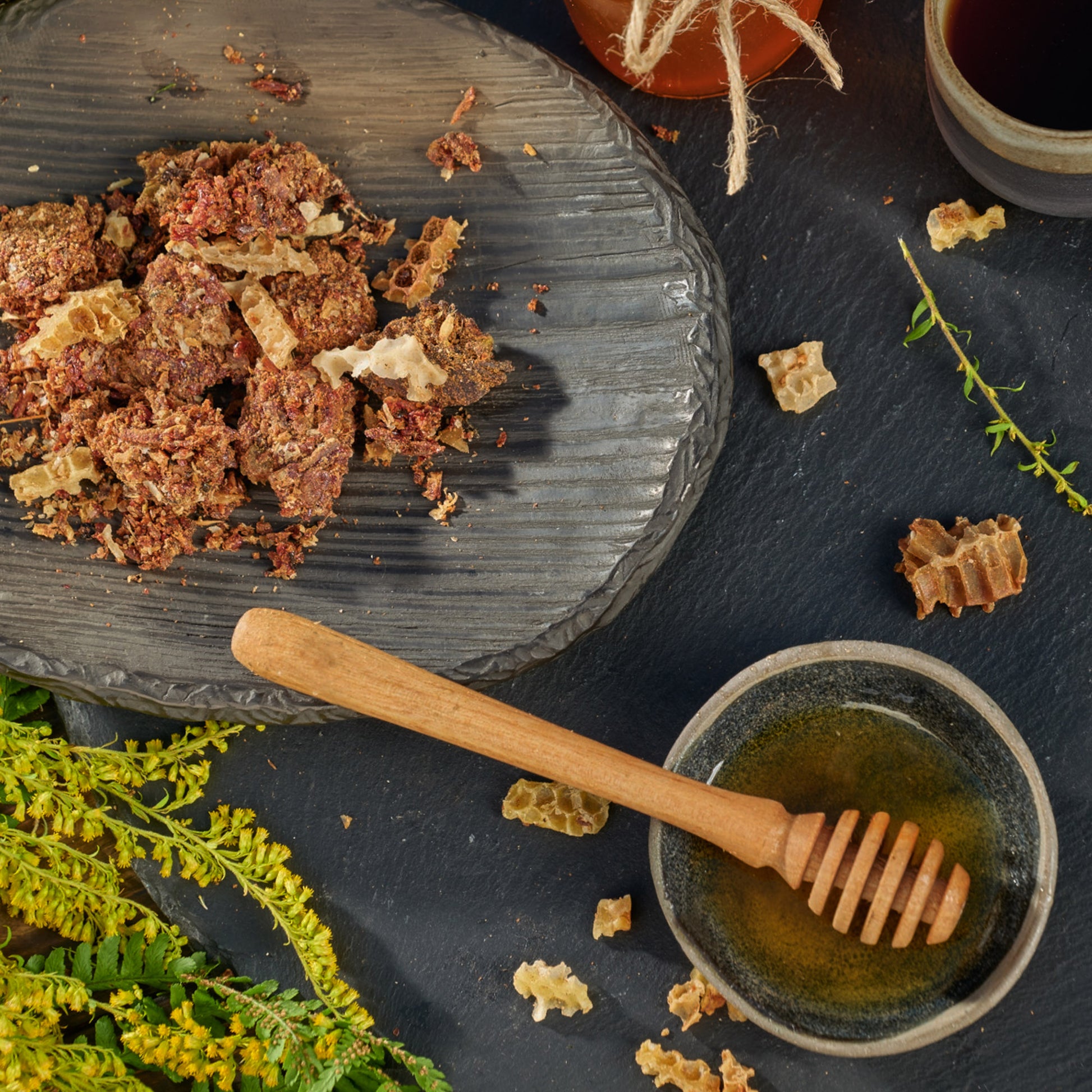 Raw honey enriched with the powerful health-promoting properties of propolis extract. A perfect superfood combination and delicious sweetener for a healthy daily routine.