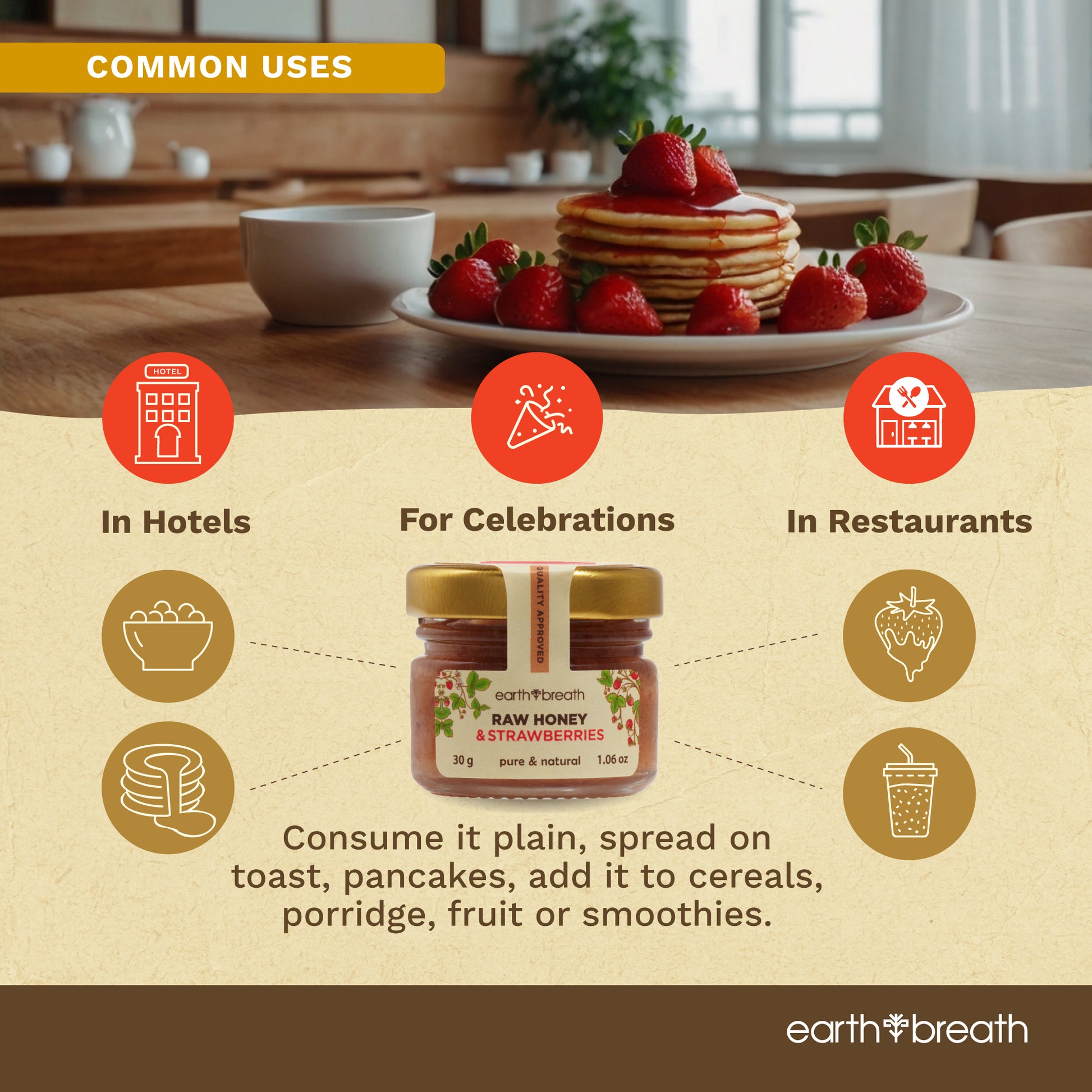 Packaging: Raw Honey with Strawberries is available in recyclable glass jars of 250g, 400g, and 30g (1.06 oz) x 16 pieces.
